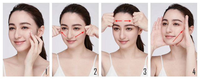 將雙手握拳,以虎口的位置從蘋果肌往太陽穴慢慢推移,拉提蘋果肌,重現紅潤氣色。