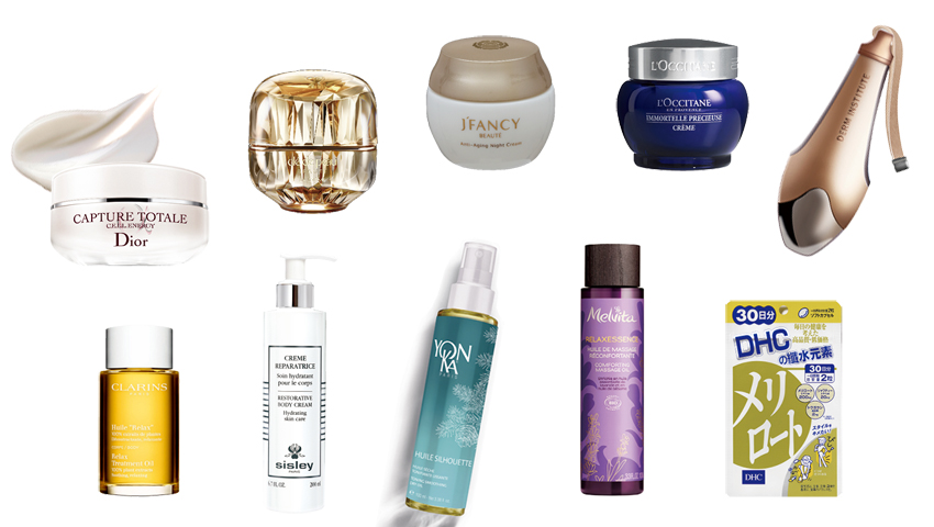 ▸ 迪奧 逆時能量奇肌霜50ml/NT4,900。肌膚之鑰 精質乳霜30ml/NT18,500。婕凡希美粧 晶彩逆齡經典晚霜45ml/NT3,980。L'OCCITANE 蠟菊精華霜50ml/NT2,650。DERM iNSTITUTE 青春能量儀/NT5,900。克蘭詩 經典纖體護理油100ml/NT2,300。Sisley 極致修護水潤身體乳200ml/NT4,900。Melvita 薰衣草舒壓好眠按摩油100ml/NT1,480。YON KA 纖勻輕活美體油100ml/NT1,950。DHC 纖水元素30日份/NT420。