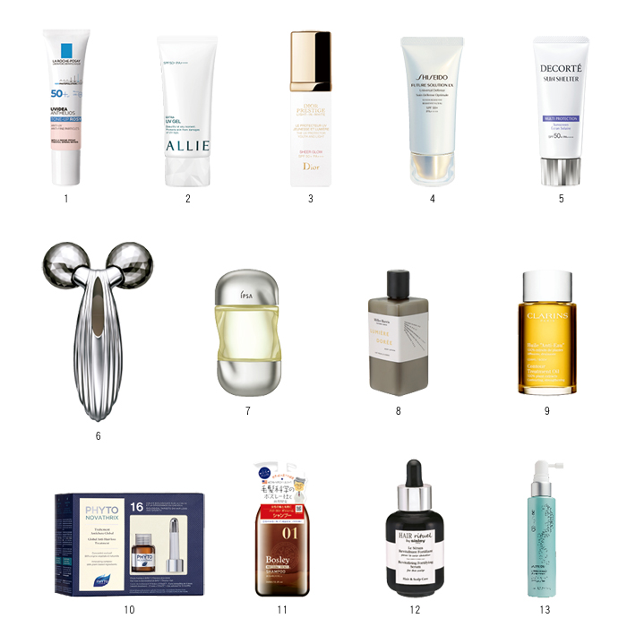 ▸ 1.理膚寶水 全護清透亮顏妝前防曬隔離乳SPF50+PA++++30ml/NT980。2.ALLIE EX UV高效防曬水凝乳N/NT850。3.迪奧 精萃再生光燦防護隔離霜30ml/NT4,000。4.資生堂 極上御藏防禦精華乳SPF50+PA++++50ml/NT3,000。5.黛珂 多重防禦隔離乳35g/NT950。6.ReFa CARAT RAY/NT8,700。7.IPSA 美膚微整身體精萃油100ml/NT1,450。8.Miller Harris 初晨之光身體乳300ml/NT1,200。9.克蘭詩 經典纖體護理油100ml/NT2,300。10.PHYTO 16賦活煥髮安瓶3.5mlx12pcs/NT6,900。11.Bosley 賦活青春養髮洗髮精360ml/NT950。12.HAIR RITUEL by Sisley 賦活重生髮精華60ml/NT5,800。13.NU SKIN ageLOC®Nutriol®賦活精萃豐盈滋養液75ml/NT1,590。