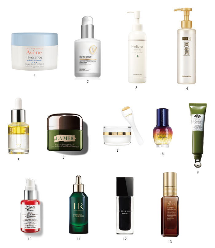 ▸ 1.雅漾 24H保濕精華膜50ml/NT1,280。2.Neogence 全能新生修護乳120ml/NT2,400。3.美樂思 All in One凝露180g/NT1,380。4.肌研 極潤多效精華水感凝露180ml/NT620。5.綠藤生機 澄澈眼部雙精華15ml/NT1,980。6.海洋拉娜 濃萃修復眼霜15ml/NT8,400。7.Sisley 抗皺活膚御緻眼唇霜與限量版亮眼美妍筆15ml/NT6,200。8.L'OCCITANE 光萃肌活亮眼修護露15ml/NT2,200。9.ORIGINS 青春無敵健康光潤修護眼膠15ml/NT2,000。10.Kiehl's 11kDa超導全能修護精露30ml/NT2,200。11.HR 植萃綠寶修護精華50ml/NT5,800。12.GIVENCHY 黑鑽奢華頂極強化新生精萃30ml/NT14,550。13.雅詩蘭黛 特潤超導賦活精萃20ml/NT3,100。