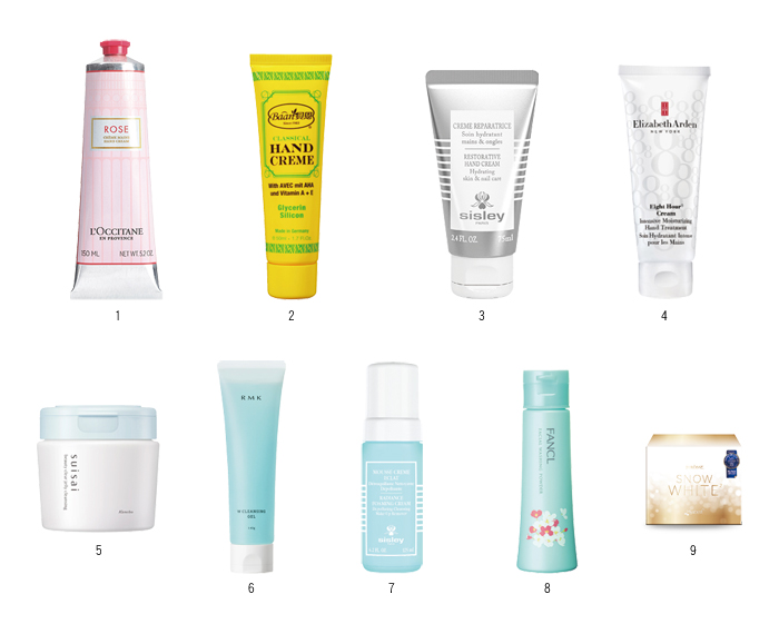 ▸ 1.L'OCCITANE 玫瑰花園護手霜150ml/NT1,100。2.貝恩 經典護手霜50ml/NT160。3.sisley 極致修護水潤美手護甲霜 75ml/NT3,000。4.伊麗莎白雅頓 八小時瞬效潤澤手霜75ml/NT1,050。5.suisai 毛孔淨透潔顏凍/NT890。6.RMK 雙效潔膚凝膠 140g/NT1,100。7.sisley 極淨亮妍卸妝洗顏泡泡霜 125ml/NT3,500。8.FANCL 2020櫻花珍藏版淨膚柔滑潔顏粉/NT650。9.婕樂纖 FDA日本強效水光錠60顆/價格電洽。