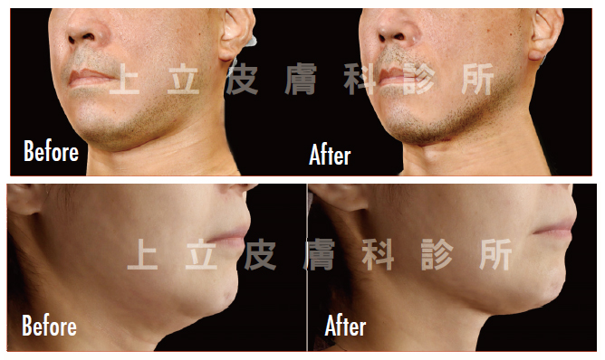 其特殊的下巴10cm2和14cm2套件設計,讓醫師能根據患者下巴大小來選擇,套件能完整包覆並固定住下巴、下顎線及上頸部範圍,使雷射能量更精準消滅下巴脂肪,達到良好的溶脂效果,術後在6∼12周後左右即可看到改善。同時,雷射熱能又能夠同步緊實肌膚,相當於溶脂、緊實一次達成,完美塑造下顎線條。
