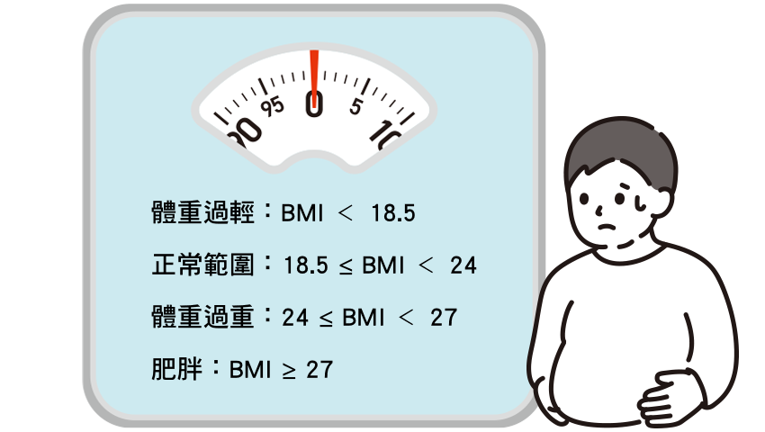 - 正常範圍:18.5 ≤ BMI < 24