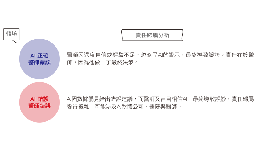 在「AI 錯誤、醫師錯誤」的情境中,AI 軟體公司是否因演算法的缺陷或未明確告知風險而負法律責任?醫院/醫療機構是否因未妥善評估或使用不合格的 AI 系統而負管理責任?而醫師是否因未盡到獨立判斷的專業職責而負最終責任?醫學界目前普遍的共識是 AI 只是輔助工具,最終的醫療決策權與責任仍歸屬於醫師。然而,隨著 AI 的普及,這份責任界線正受到前所未有的挑戰。