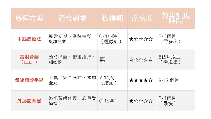 為了幫讀者精準定位,我們整理了育髮方案對照表: