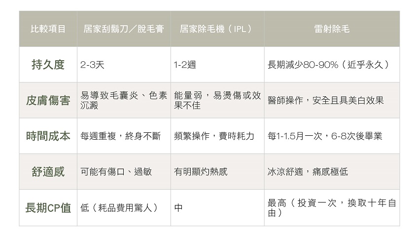 很多讀者會問:「我自己買除毛機或刮毛不行嗎?」讓我們用一張表看懂兩者的差異。