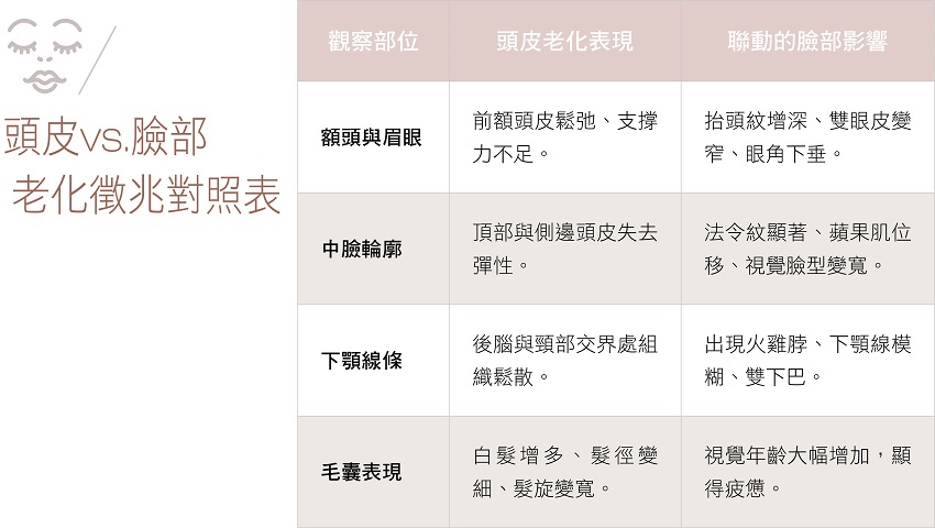 當頭皮因膠原蛋白流失、紫外線傷害或長期壓力而失去彈性時,這股「鬆弛力」會順著重力向下位移。醫學統計顯示,頭皮每鬆弛1公釐(mm),反映在視覺上,臉部就會下垂將近1公分(cm)。 這意味著,你擔心的眼角下垂、法令紋加深、甚至模糊的下顎線,源頭可能都在被秀髮覆蓋住的頭皮。