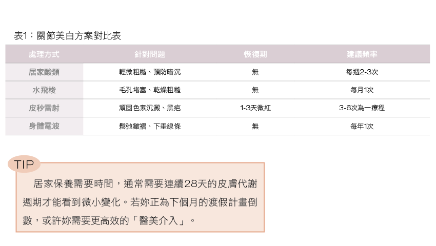 若妳觸摸關節時感到明顯的粗糙顆粒感,醫學級的果酸煥膚能深層剝離堆積角質;而水飛梭則能透過負壓吸引與精華液注入,同步完成清潔與深層補水,讓關節瞬間透亮。
