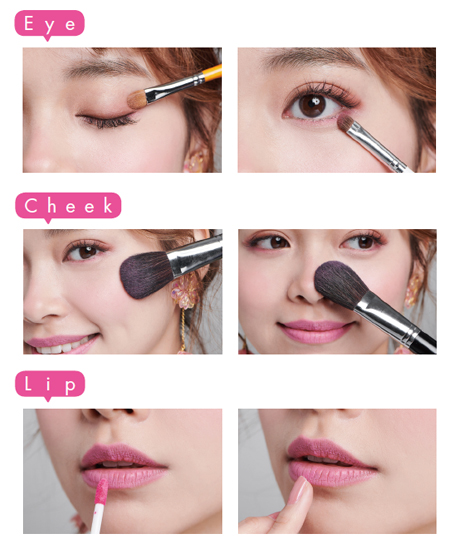 02選擇粉紅色眼影,刷在眼摺及下眼瞼,打造楚楚可憐小兔眼。
