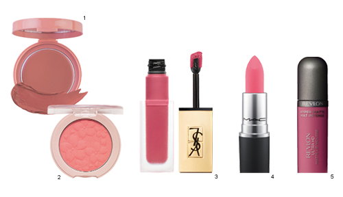 ▸ 1.LOVE ME MORECREAM羞飾腮紅慕斯4g/NT280。2.ETUDE HOUSE粉好氣色腮紅餅#PK001 6g/NT350。3.YSL絲絨唇露#NO.18 6ml/NT1,350。4.M.A.C絲柔粉霧唇膏#SexyButSweet 3g/NT750。5.露華濃HD超霧感唇釉5.9ml/NT360。