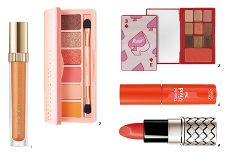 ▸ 1.COFFRET D'OR光透立體眼彩蜜3.2g/NT750。2.BeautyMaker緋紅絕色眼影盤5.4g/NT470。3.I'M MEME我愛心機電眼撲克盤003#甜橙紅茶8g/NT790。4.ETUDE HOUSE多彩多汁水凝唇露#OR202 4g/NT350。5.MAQUillAGE心機大人系雞尾酒特調唇膏#OR404落日台場 2.2g/NT420。