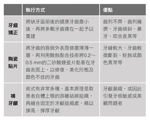 然而,一般人通常是因為外傷或蛀牙而缺牙,才會接受人工植牙,針對齒列不齊、牙縫較大、牙齦萎縮等問題,則不須拔除原本的自然牙再植牙,只要藉由牙齒矯正、陶瓷貼片、補牙齦等方式,就可打造更美觀的口腔門面。其原理、做法和適應症如下: