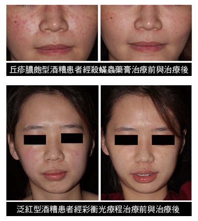 如針對丘疹膿皰型酒糟患者,往往是與毛囊中的寄生蠕形蟎蟲的增生有關。一般正常人蟲量每平方公方約在5隻以下,而在酒糟患者,尤其是丘疹膿皰型患者的平均蟲量往往比正常人高到18倍之多。建議患者尋求專業的皮膚科醫師作進一步的顯微鏡化驗,如蠕形蟎蟲數量有增加的情況,則建議塗抹含殺蟎蟲成分的雙效去蟎蟲乳膏治療,才能穩定控制。