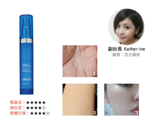 ▶ ①清透好吸收的質地。②使用同時可聞到淡淡的香氣。③使用一陣子皮膚變得穩定有光澤。