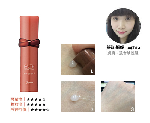 ▶ ①清透偏水狀質地。②吸收快不黏膩。③使用後,肌膚呈現清透緊緻感。
