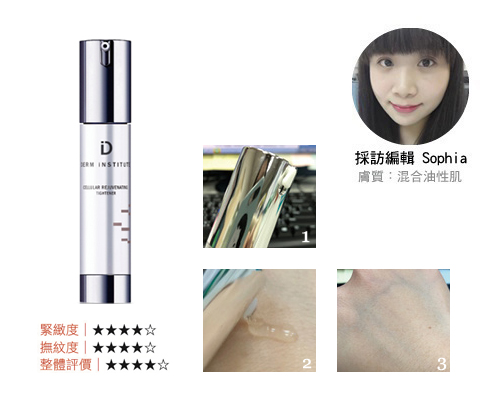 都說現在的人老得快,這都是因為壓力、使用3C產品等等所影響,就連我經過長期的看電腦,都覺得肌膚變的蠟黃、下垂了呢!這時可以使用DERM iNSTITUTE的「肌因抗老瞬效緊緻精華」,擁有小分子量的緊緻三胜肽、抗皺五胜肽以及珍稀奈米鉑金胜肽直擊老化根源,釋放修護效能。使用時,只要一顆米粒的大小就可以塗滿全臉,好推開的質地使用時可以搭配少許按摩步驟,就連油肌的我都能夠放心的使用它,肌膚較乾就可以多擠一點,讓冬天肌膚一樣能夠擁有彈潤肌。