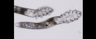 我幫孔小姐在皮膚上取檢體做檢測,顯微鏡下可看到大量的毛囊蠕形蟲。