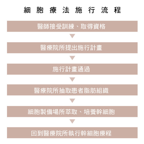 除了治療實體癌、慢性缺血性腦中風、退化性關節炎及膝關節軟骨缺損之外,自體脂肪幹細胞也可應用於整形醫美,主要有「改變外觀」、「促進新生」等兩大功效。舉凡促進傷口癒合、加速組織缺損修復、增加脂肪填補的脂肪細胞存活率,以及抑制過敏及減少發炎反應等,都是自體脂肪幹細胞療法可期待的效果。「特管辦法」正式上路後,所有施行醫師都必須先接受16個小時的細胞治療技術相關訓練,取得操作醫師資格證明,同時所屬醫療院所向衛福部提出施行計畫,獲准後才可在醫療院所抽取患者脂肪組織,送至具備符合規範的「細胞製備場所」萃取、培養,再送回原醫療院所,由施行醫師進行相關療程。