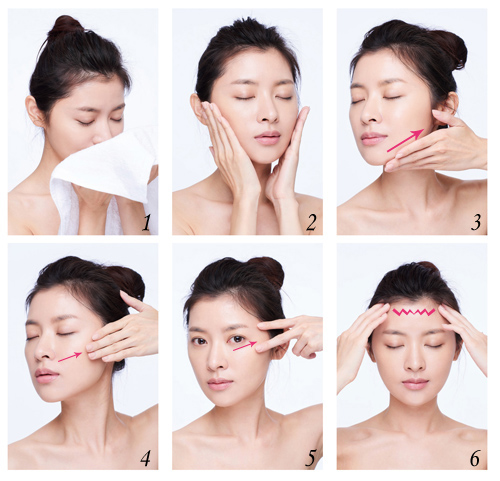 取出適量美容油或乳霜,雙手溫熱後輕輕地覆蓋於全臉肌膚上。