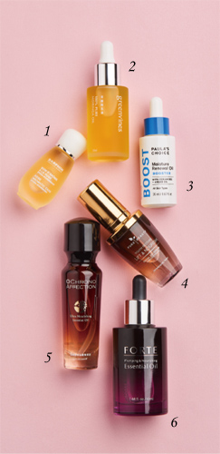 〈1〉DARPHIN玫瑰芳香精露15ml/NT2,400。〈2〉綠藤生機奇蹟辣木油30ml/NT580。〈3〉寶拉珍選特潤植萃精華油20ml/NT1,680。〈4〉Pure Beauty紅蔘肽緊緻活膚精華油30ml/NT980。〈5〉時間寵愛極潤橙萃滋養精華油30ml/NT1,280。〈6〉FORTE豐潤肌活精華油50ml/NT3,200。