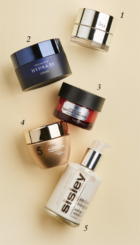 〈1〉IPSA緊緻集效賦活霜30g/NT4,000。〈2〉AHC瞬效保濕B5乳霜50ml/NT850。〈3〉THE BODY SHOP漢蔘根莖菁萃緊緻活顏霜50ml/NT1,680。〈4〉初時肌玫瑰果油活顏晚安霜50ml/NT1,680。〈5〉Sisley全能乳液125ml/NT7,200。