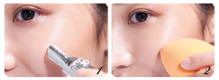 ② 以指腹沾取少量的遮瑕輕點在眼下、鼻翼容易掉妝的局部,可以再刷少量蜜粉定妝。