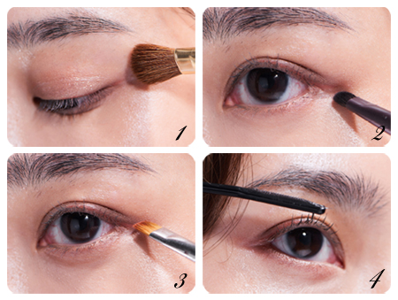 ① 沾取帶紅調的大地色眼影,暈在雙眼皮上,打造深邃眼部輪廓。