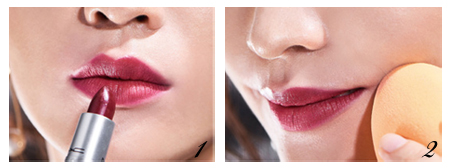 ② 再使用沾粉底或遮瑕的海綿,修飾嘴角、唇峰讓唇彩界線模糊。