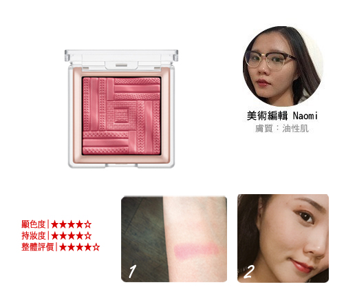 非常時尚的編織紋設計有別於一般腮紅,讓人使用上心情也非常好。輕輕使用就像皮膚白裡透紅的感覺,若喜歡妝感重一點也可沾取多次,輕刷於頰部也不會有妝濃的感覺。氣質感的乾燥玫瑰色不管使用什麼眼妝都非常適合,早上出門使用晚上回到家也完好如初,大熱天也不怕飛粉或不服貼。