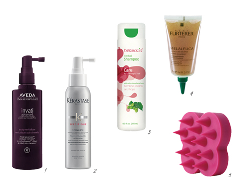 → 1.AVEDA 蘊活菁華滋養液150ml/NT2,600。2.巴黎卡詩α 胺基酸頭皮全能精華125ml/NT1,800。3.小甘菊 啤酒花竹萃洗髮精250ml/NT280。4.RF荷那法蕊 MELALEUCA 白千層抗屑去角質平衡菁華75ml/NT1,680。5.uka 舒活頭皮按摩刷/NT680。
