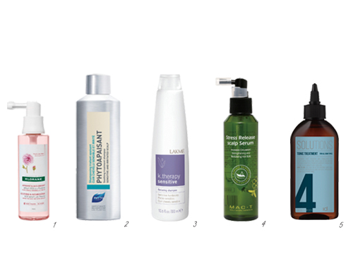 → 1.蔻蘿蘭 SOS舒敏頭皮精華液65ml/NT1,100。2.PHYTO舒敏平衡洗髮精200ml/NT750。3.萊肯 冰鎮洗髮精300ml/NT780。4.MAC-T 寧.紓壓頭皮精華150ml/價格電洽。5.TIGI 頭皮滋養液200ml/NT1,600。
