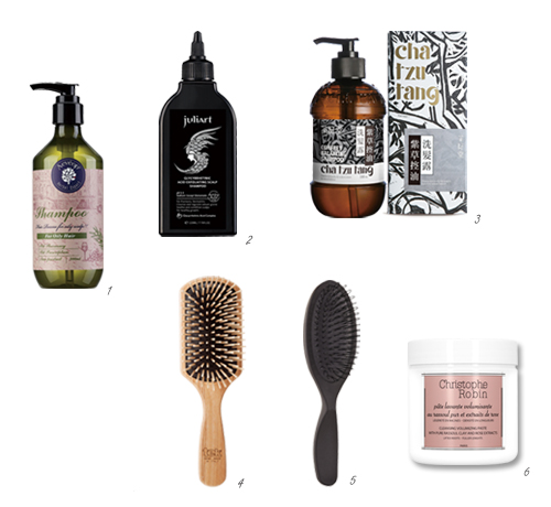 → 1.Aevéop 控油洗髮精(鈴蘭花)300ml/NT450。2.JuliArt 甘草次酸角質淨化液220ml/NT900。3.茶籽堂 紫草控油洗髮露300ml/NT580。4.AVEDA 頭皮淨瑕去角質梳/NT1,200。5.Tek 梣木梳王/NT1,980。6.Christophe Robin 玫瑰豐盈淨化髮泥250ml/NT1,680。