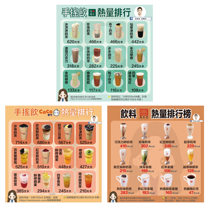 奶茶要少喝,酸的飲料也要盡量少喝,那還有什麼手搖飲料可以點呢?敏敏營養師很推薦點水果茶或是純茶類喔!水果茶幾乎都是用新鮮的水果加茶去製作的,像是:葡萄柚綠、柳橙綠等等,因為水果本身就有甜味,所以沒加糖也是OK的喔!純的無糖茶類更是手搖飲料中的低熱量飲料,可以點無糖的也很美味喔!以下是大家常喝的奶茶熱量(容量約為大杯計算):