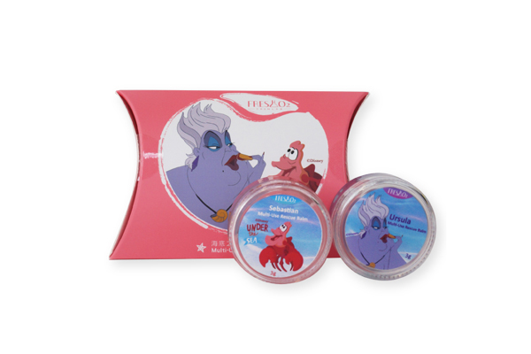由FreshO2 SkinLab肌膚實驗室團隊專業打造,從日常彩妝最必需的洗卸類產品為基礎,以敏弱肌也可使用為研發。海洋悠遊眼唇卸妝油3秒溶解防水濃密型彩妝,使用向日葵籽油為基底,沖洗快速、不油膩、不緊繃,添加日本神聖藻,其優異的吸水保濕效果是一般玻尿酸的10倍,有效促進肌膚保護膜形成,搭配紅石榴油提煉精華,能預防紅腫不適,並提亮洗卸後肌膚,不刺激、不殘留,防水濃妝快速潔淨,3秒卸除還給肌膚悠遊自在!海底世界泡泡洗顏粉單純6種成分,以玉米澱粉為基底,增加洗顏過程的滋潤度,防止肌膚過度摩擦,添加南瓜酵素去除肌膚老廢角質,預防油脂與髒污堵塞而導致的閉鎖性粉刺,搭配具優異吸水保濕效果的日本神聖藻,以及提亮洗卸後肌膚的紅石榴油提煉精華,極度溫和的酵素洗顏,洗後不緊繃乾澀,零刺激的極簡清潔,敏弱肌也能安心使用。海底之聲萬用鎖水膏組以兩大厚唇代表-烏蘇拉及賽巴斯汀為主角,添加高比例維他命E與黃金海藻萃取,維持肌膚角質層,保護皮膚不受紫外線傷害,持久滋潤雙唇,預防肌膚乾裂不適,搭配白芒花籽油與摩洛哥堅果油,修護與滋養肌膚,增加保濕並鎖住水分,凡士林基底適用於所有年齡與肌膚部位,多元用途,嘴唇乾裂、指緣死皮、關節乾燥、臉部脫皮皆可使用。另外搭配限定周邊海洋公主隨身吊鏡,獨特貝殼造型以七彩炫光亮片點綴,耀眼奪目,內嵌吊繩可掛於包包、各式隨身物品上,輕巧攜帶便利,輕鬆補妝無煩惱。全系列共推出四款單品,以可愛帶來日常療癒感,保持海底暢游般的歡樂單純。