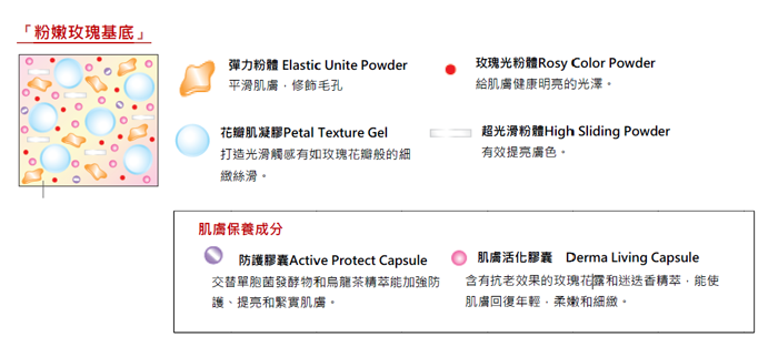 因此,ALBION 專業團隊研發出全新「粉嫩玫瑰基底」,加入了抗老效果卓越的「玫瑰花露」與「迷迭香精萃」,讓肌膚重返柔嫩、細緻,更顯年輕,同時並加入「烏龍茶精萃」,提亮並緊實肌膚。而為了呈現「粉嫩玫瑰」般的迷人膚色,則加入「玫瑰光粉體」、「花瓣肌凝膠」等成分,輕輕一抹,瑕疵立即隱形、臉龐綻放自然玫瑰色澤,膚質更是絲滑細緻、呈現頂級質感偽素顏妝容。