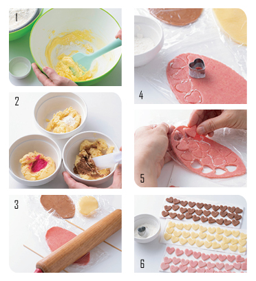 分出幾個麵團球,分別調和不同的顏色。為了讓原色麵團的軟硬度與調色麵團一致,須另外加入低筋麵粉。