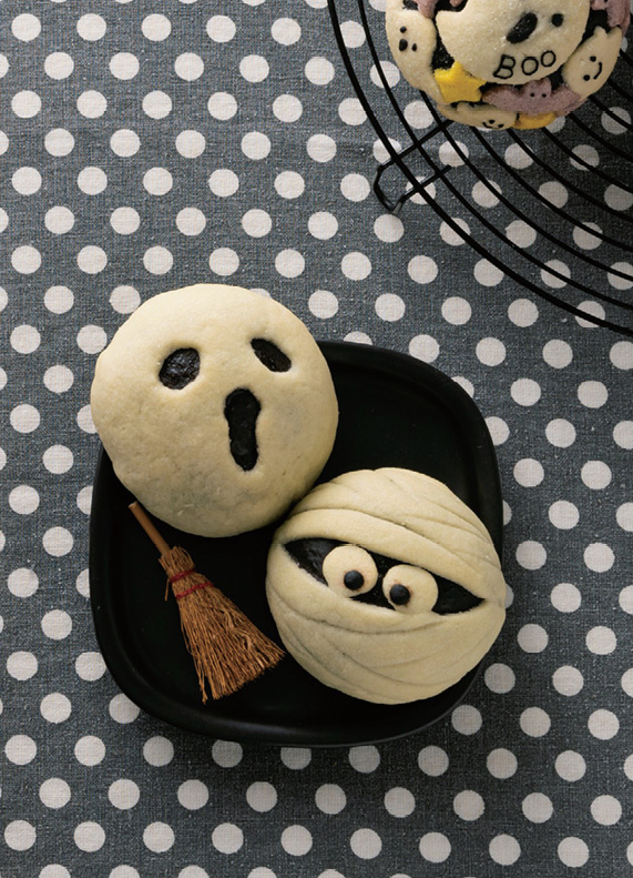 〈4〉以預熱至170度的烤箱烘烤17分鐘左右之後,等待放涼,木乃伊的眼睛用糖霜畫上去。
