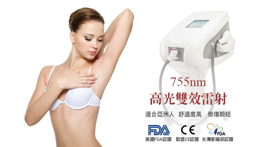 辛奇洋醫師進一步說明,通過美國FDA、歐盟CE與台灣衛福部多重認證「高光雙效雷射」,其治療原理是採用755nm波長的二極體雷射,755nm波長對於黑色素專一性高,相較於其他波長更能夠有效打擊黑色素,對於去除黑色素的淨白效果優異,因此除了美白,還有除毛的效果,因為毛髮中的毛囊含有黑色素,毛囊黑色素會吸收雷射能量、破壞毛囊,進而達到除毛效果。