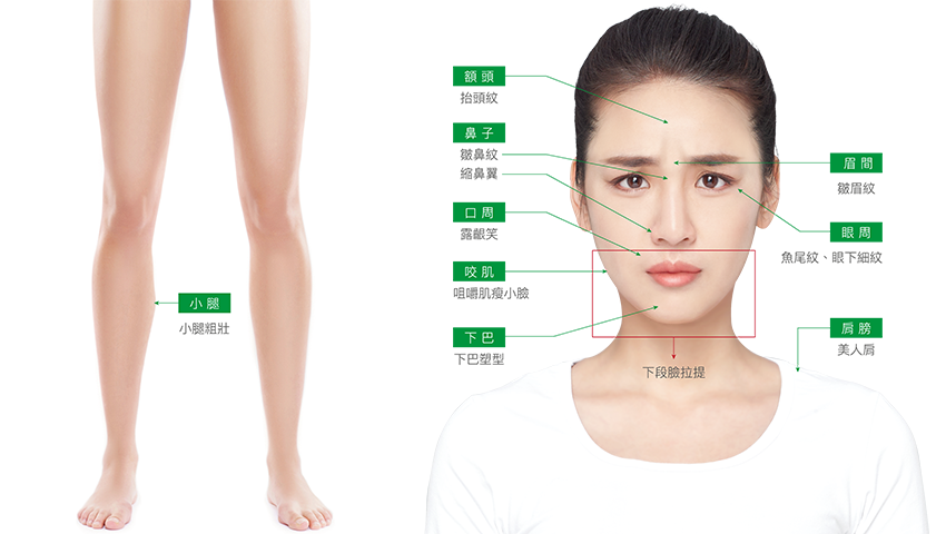 - 臉部皺紋: 主要用於改善因表情肌肉活動而產生的動態紋路,如抬頭紋、皺眉紋、魚尾紋等。
