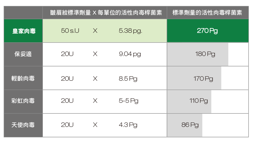 ▲台灣市面上肉毒品牌皺眉紋標準劑量所含之活性肉毒桿菌素含量