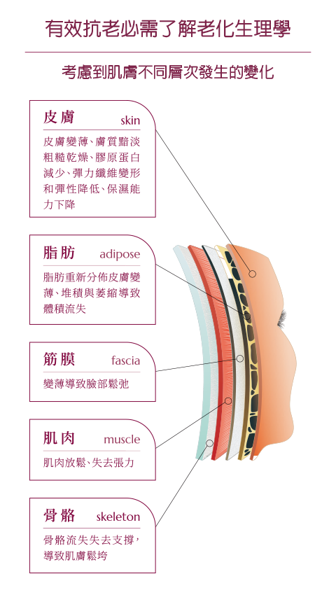 林亮辰院長以他多年來在皮膚專科的臨床經驗表示,傳統的抗老思維,往往只聚焦於單一問題或單一保養層面。然而,老化是一個複雜的生理過程,包括骨骼流失、肌肉鬆弛、筋膜變薄、脂肪萎縮,膠原蛋白減少、彈性下降、保濕能力減弱,無一不受到影響。只針對表皮做文章,治標不治本,效果自然有限。