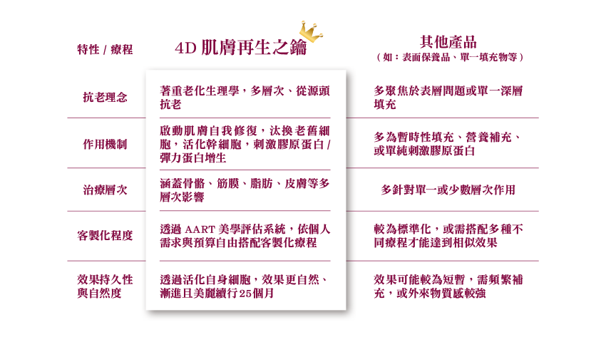 如表格所示,4D肌膚再生之鑰的優勢在於其對老化機制的全面理解,以及透過啟動肌膚自身修復能力,從根本上解決問題,這是一般產品無法做到的效果。