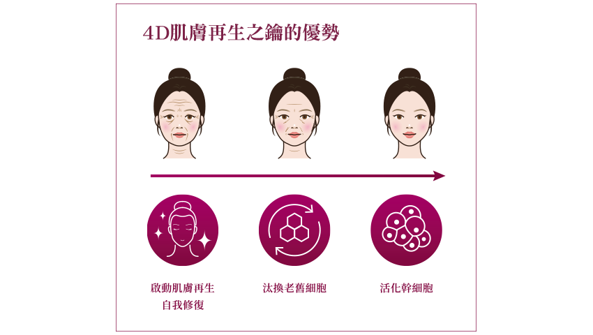 一項治療產品若可分層、分次、分類,就能針對不同的肌膚困擾精準治療,啟動肌膚再生自我修復能力、汰換老舊細胞及活化幹細胞的能力,達到從源頭抗老、自然漸進的效果——這就是「4D肌膚再生之鑰」最獨特之處。