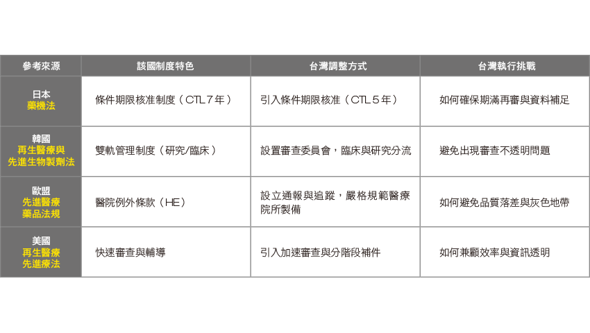 台灣《再生醫療製劑管理條例》明定「條件期限核准」最長 5 年,要求廠商或醫療機構必須在期限內補充療效與安全性資料,直接參考日本制度。