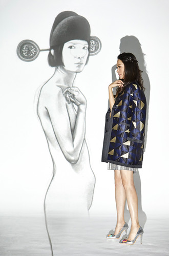 (深藍色幾何大衣、銀色百褶洋裝 by Max & Co.)