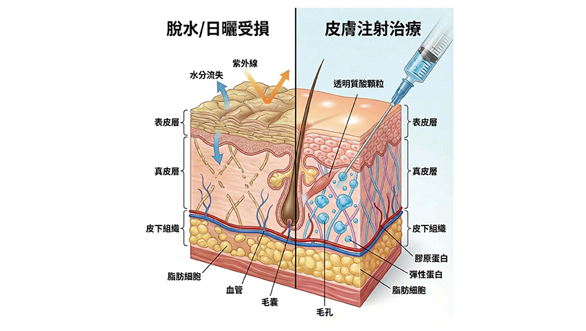 - 水光注射(Mesotherapy):將小分子玻尿酸直接注入真皮層。對於長期風吹日曬造成的「乾荒肌」有奇效。當細胞飽滿了,皮膚自然會透出光澤。一個健康的小麥色光澤肌,遠比蒼白卻乾癟的皮膚迷人。