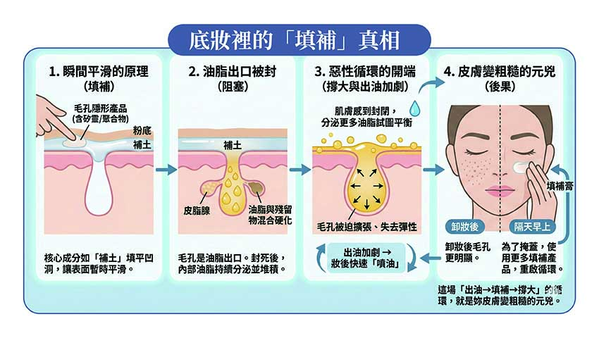 當妳晚上卸妝時,發現毛孔似乎變得更明顯了,於是隔天早上,妳用了更多的填補膏。這場「出油→填補→撐大」的循環,就是妳皮膚變粗糙的元兇。