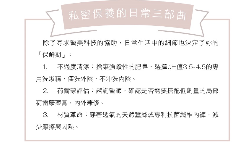 「私密微整」不應該是為了取悅另一半,而是為了取悅妳自己。當妳感覺身體是舒適的、潤澤的,妳在社交與家庭中展現出的那份從容與魅力,才是真正維持關係的「最高級荷爾蒙」。
