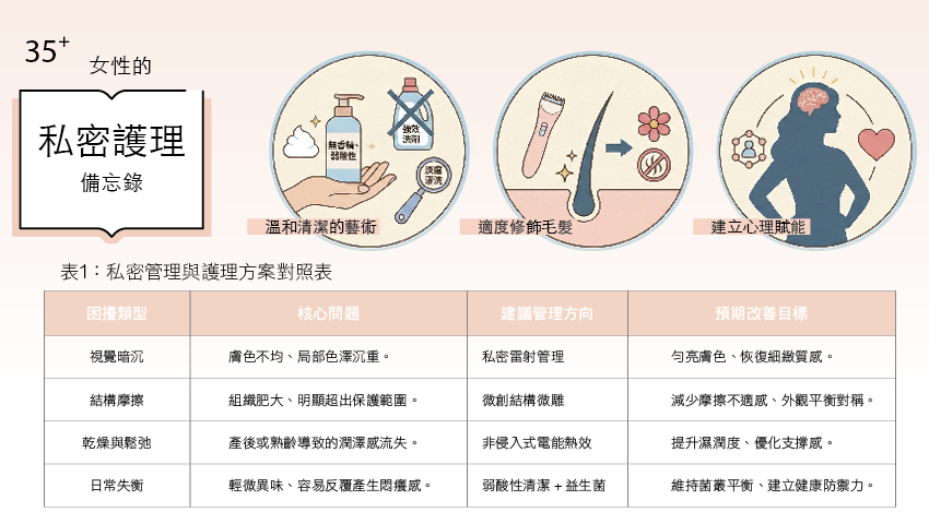 - 建立心理賦能:了解並接受自己的生理構造。私密保養不是羞恥,而是一種像「健身」一樣,對自我身體的精準投資。