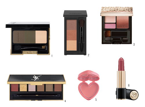 1.SUQQU 晶采3D眉彩盒6.7g/NT2,500。2.Celvoke 玩色立體眉粉2.1g/NT1,250。3.SHISEIDO 心機星魅漸層特調眼影#RD3324g/NT950。4.YSL 限量秋妝-楓狂率性六色眼彩盤/NT2,800。5.4U2 YOU HEART ME心型刻字腮紅#C1/NT280。6.蘭蔻 絕對完美鑽石霧光唇膏#03/NT1,150。
